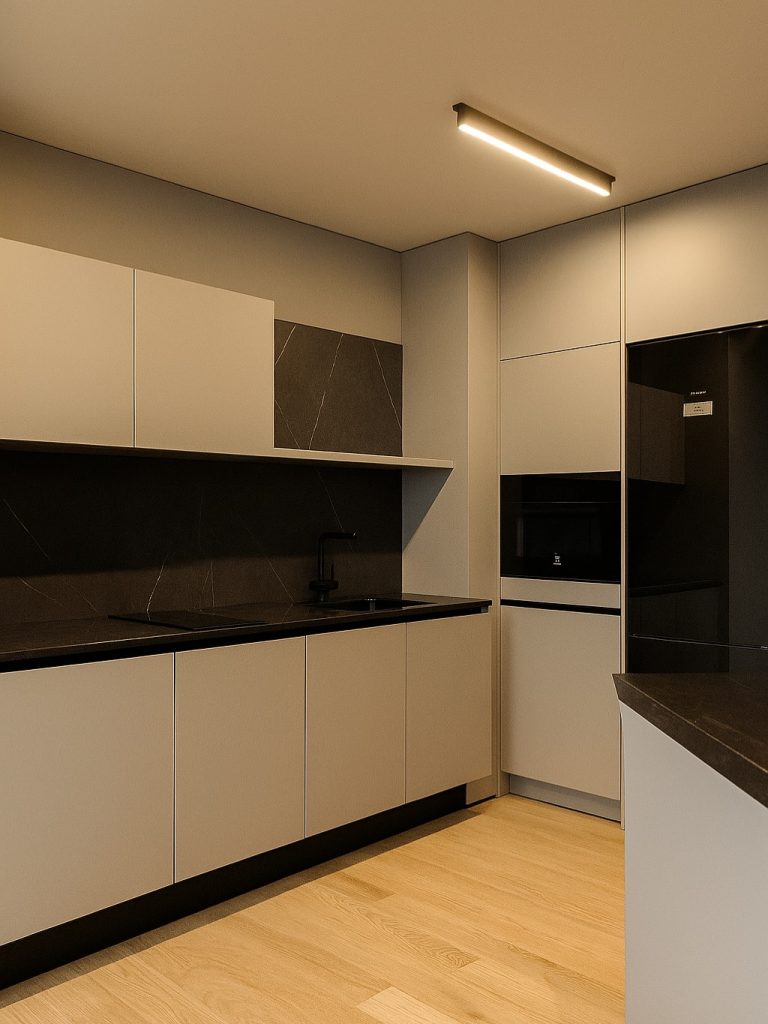 Kuzhinë bashkëkohore me dy ngjyra me detaje druri