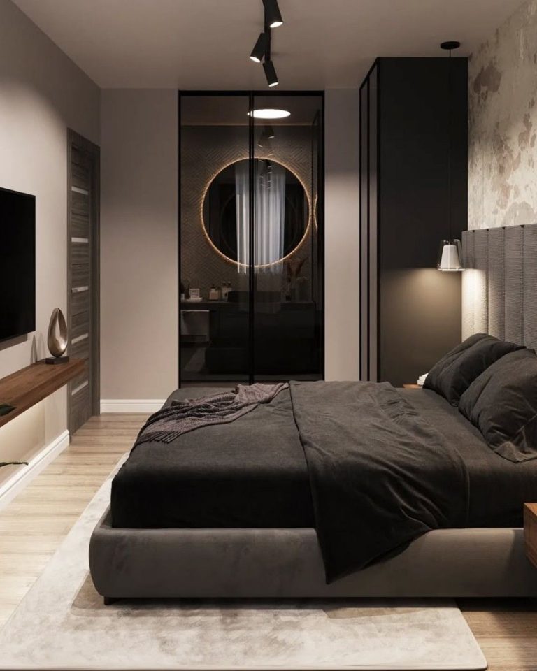 - Dhomë gjumi me nuanca të errëta me minimalizëm...