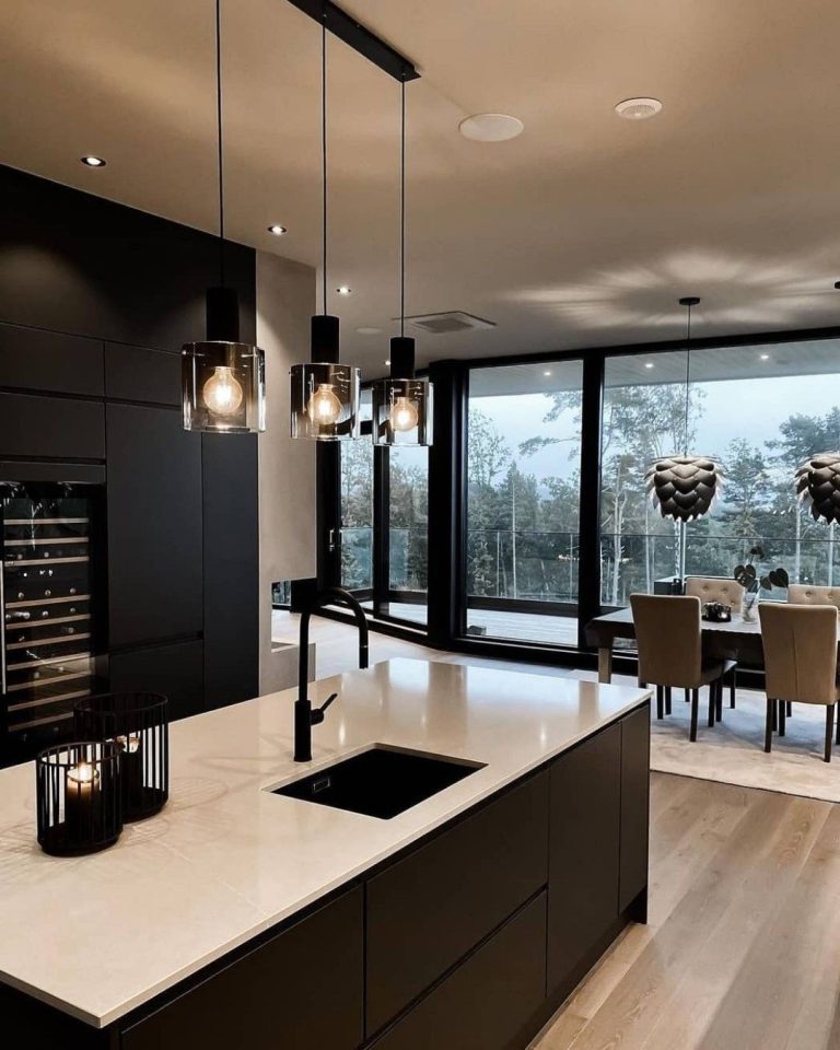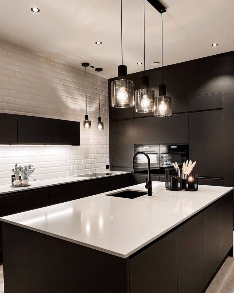 Kuzhinë moderne e zezë me banakë të bardhë