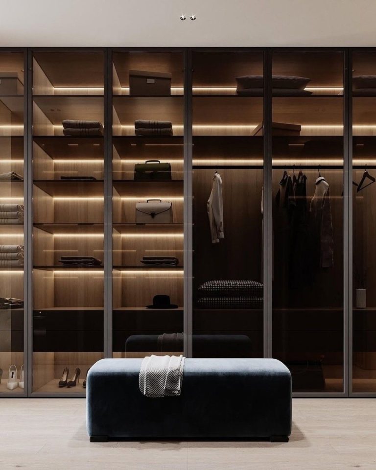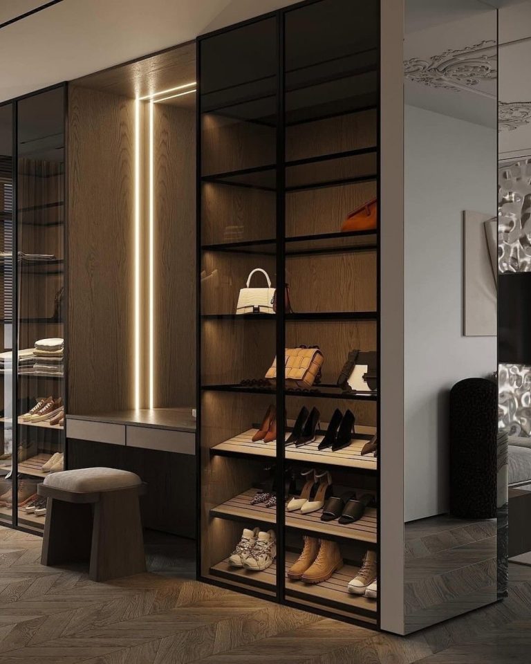 Gardërobë moderne me derë xhami me ndriçim ambienti