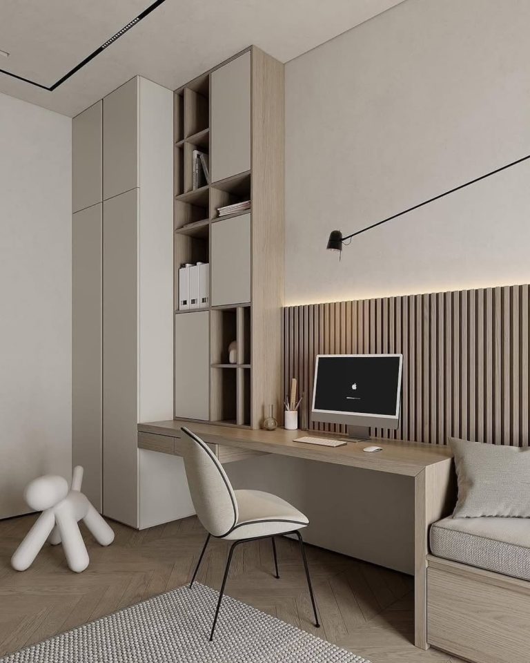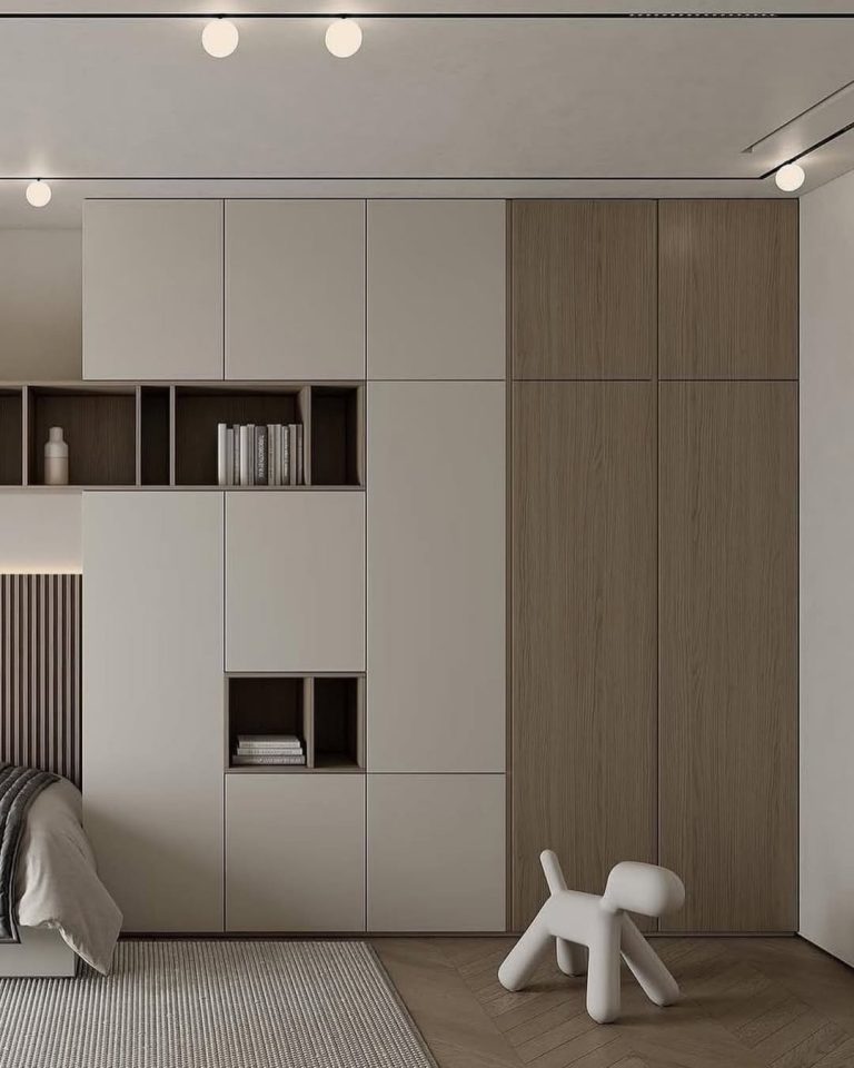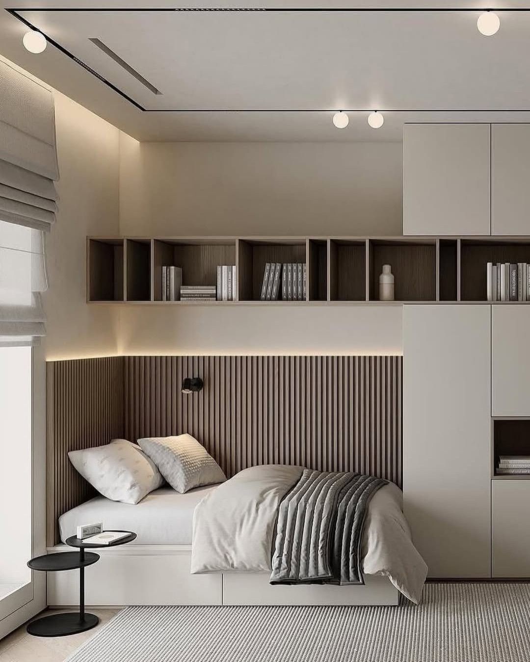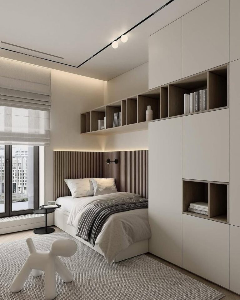 Dhomë gjumi moderne minimaliste me rafte dekori